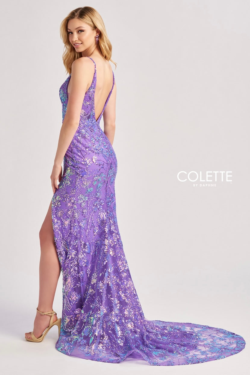 Fit to flare gown with sweetheart neckline, stretch sequin mesh, tulle, low back, and slit