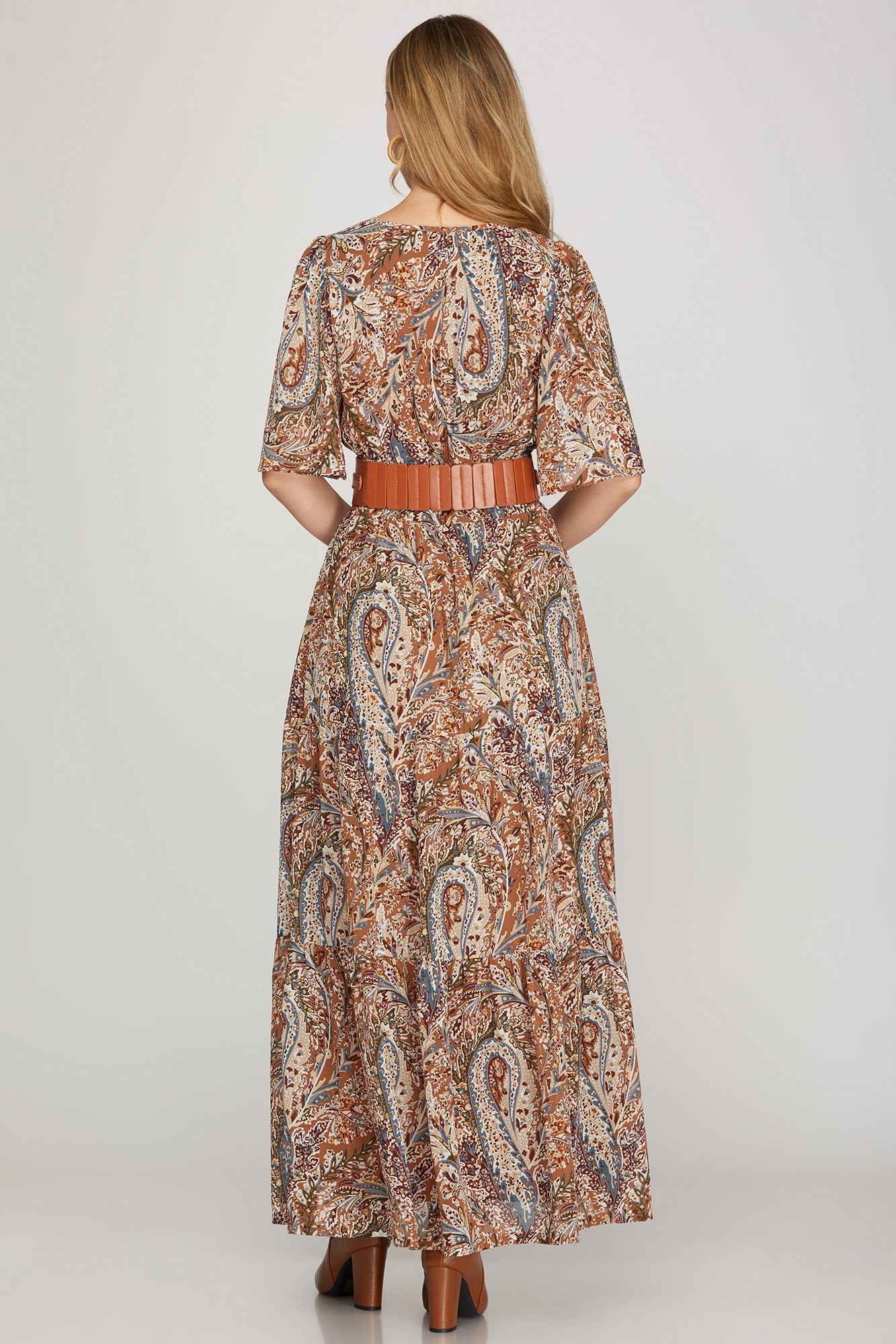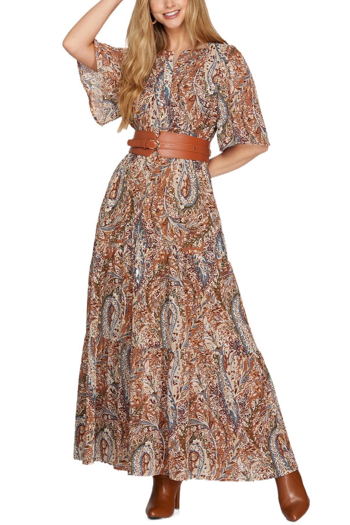 Half flutter sleeve woven print tiered maxi dress with full lining and pockets