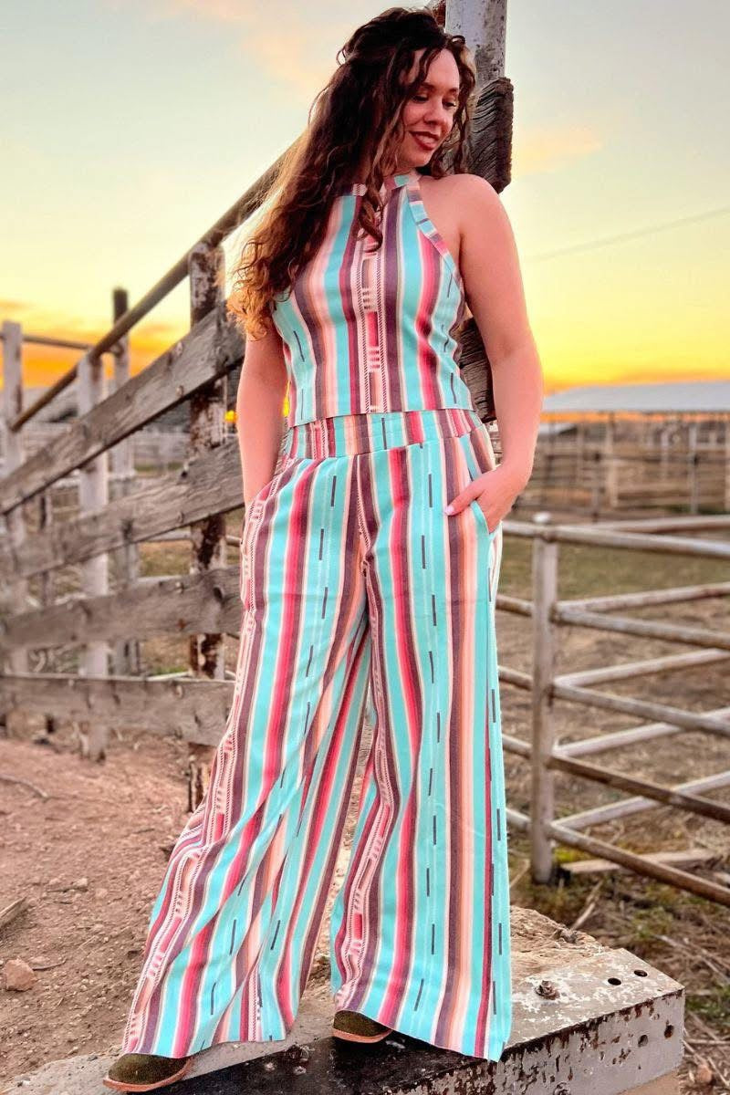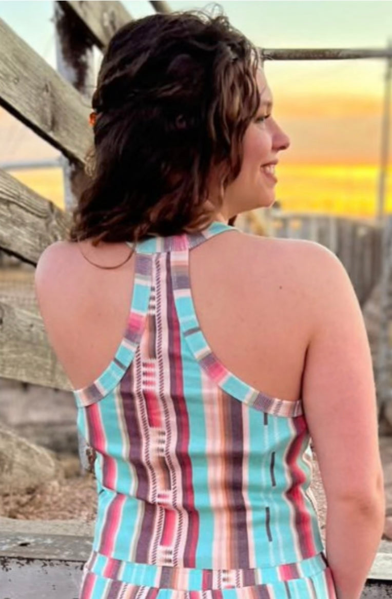Serape Racerback top, raw hem able to cut to fit as desired and the hem won’t fray, 35% cotton 65% polyester