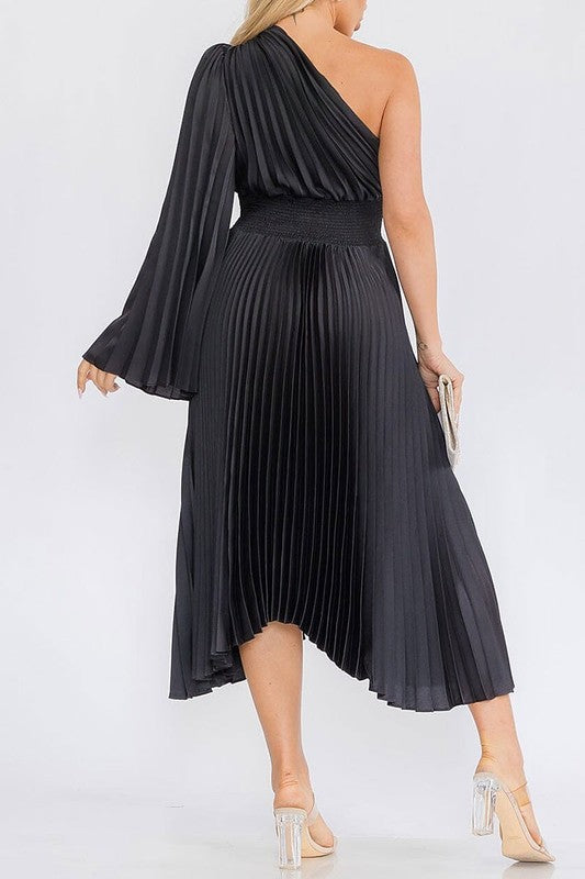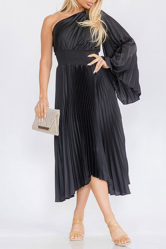 One shoulder bell sleeve smocked waist pleated dress, 97% polyester 3% spandex