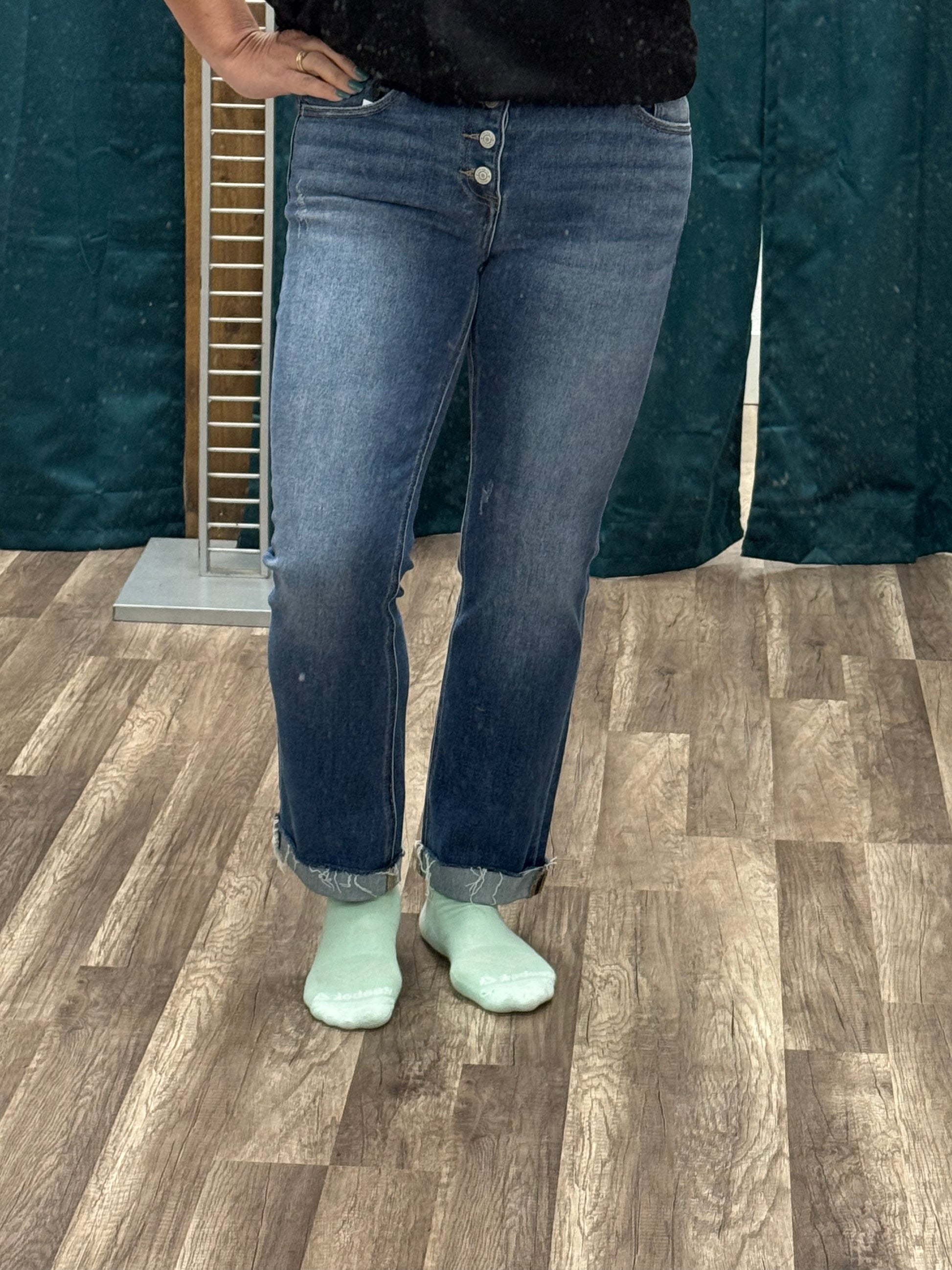 Straight fit button fly jeans. High rise