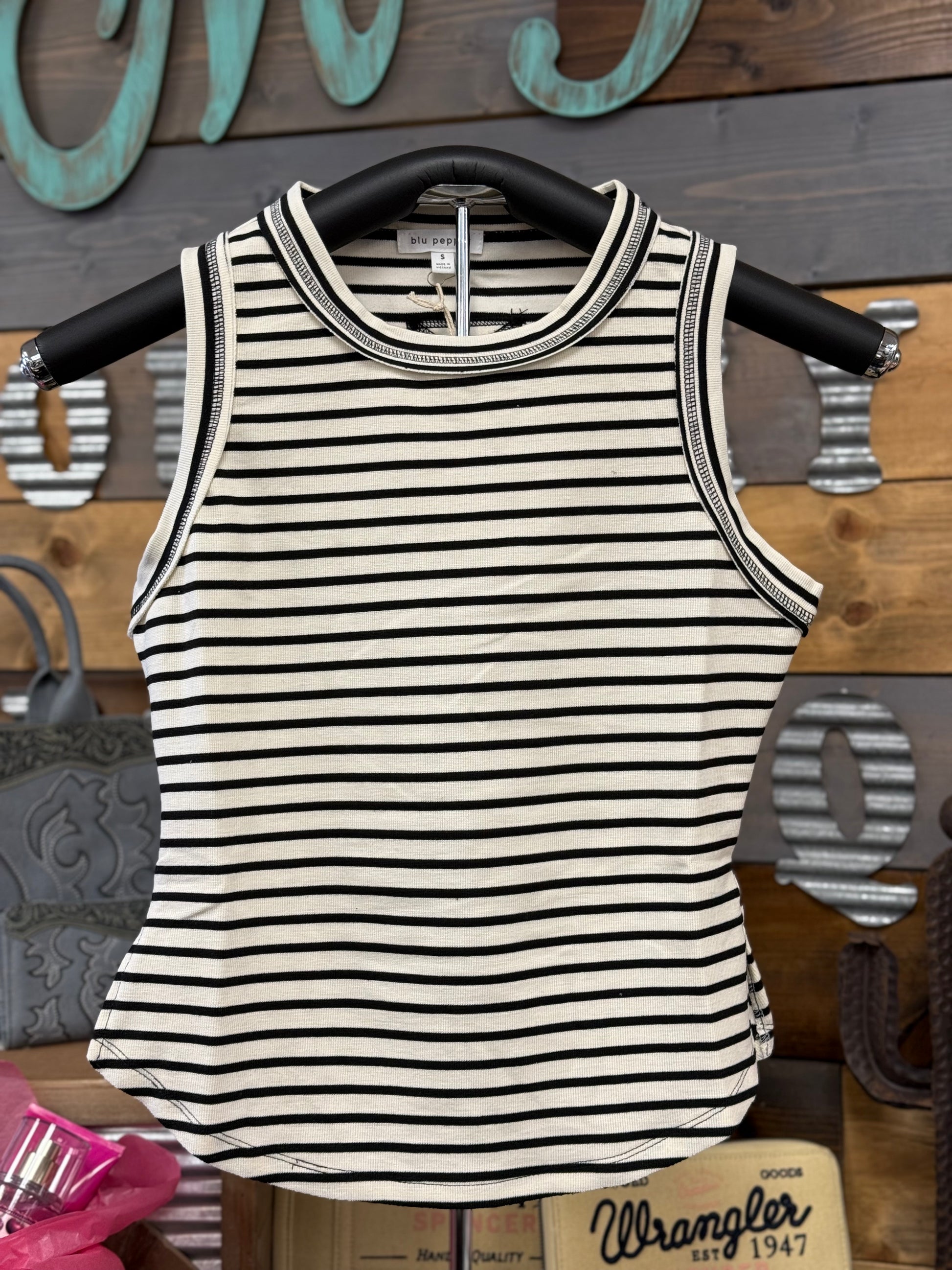 Stripe round neck sleeveless knit tank top, 55% polyester 40% cotton 5% spandex