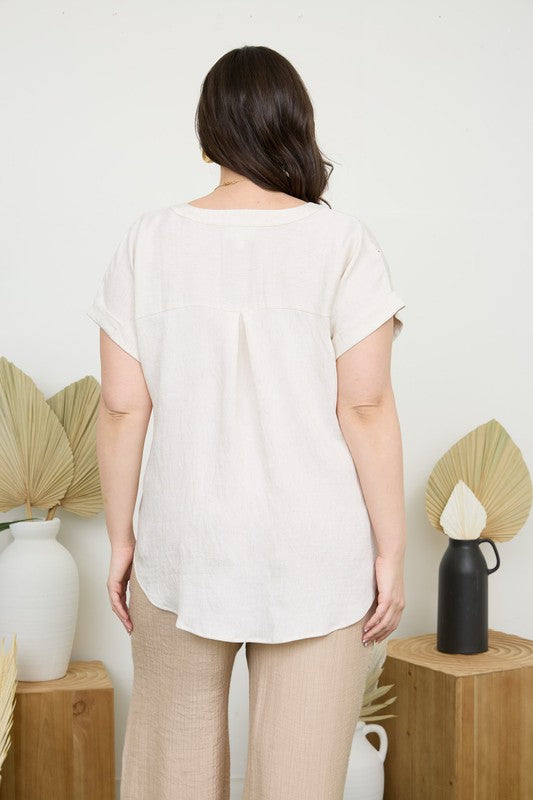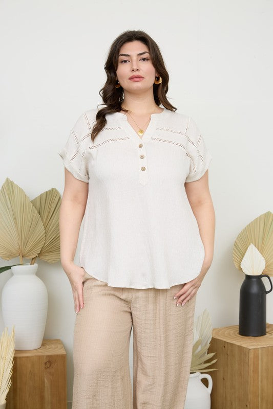 Crochet lace trim short sleeve Henley blouse, 70% rayon 20% nylon 10% linen