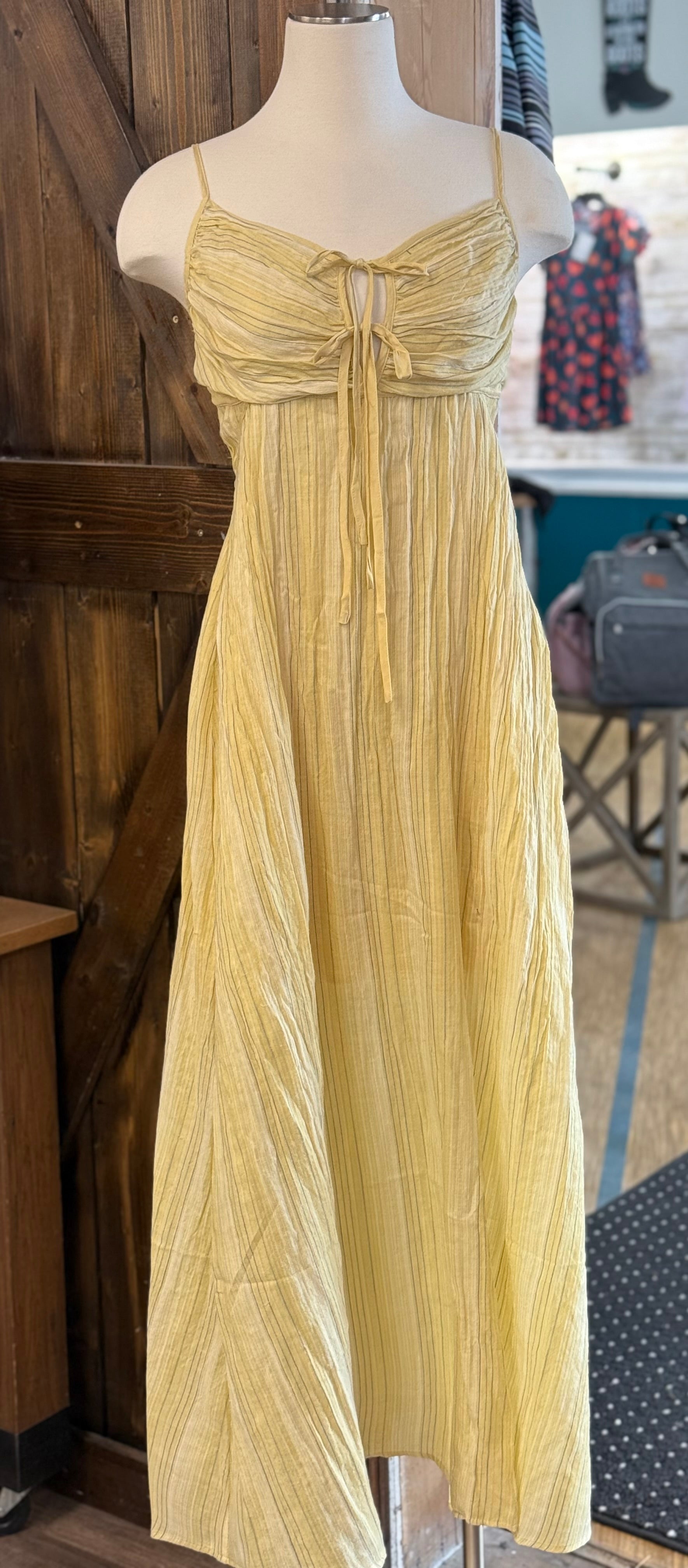 Maxi thin striped yellow dress with tie bow front and pleated top, 100% polyester