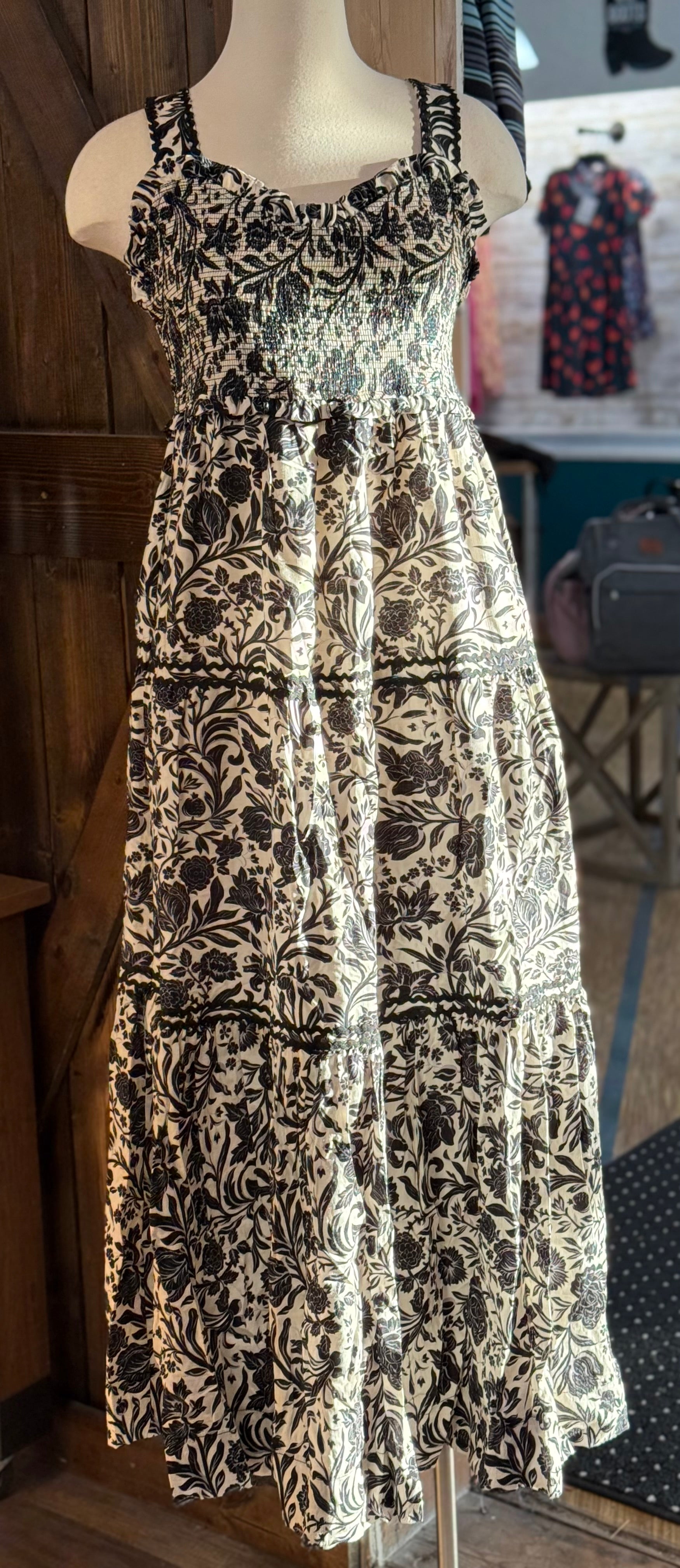 Shoulder satin tie smocked woven print tiered maxi dress with side pockets, 100% cotton