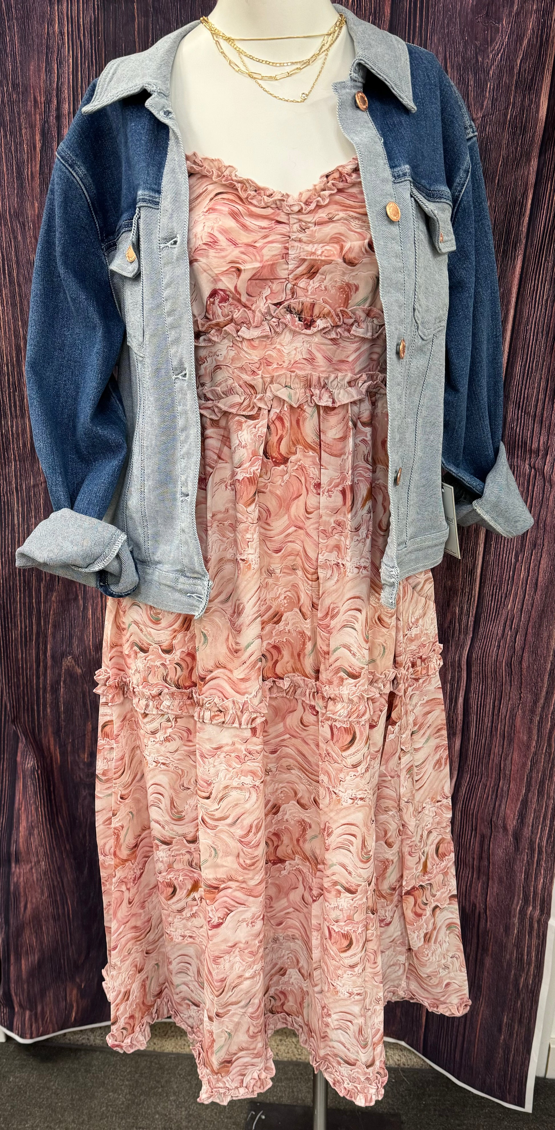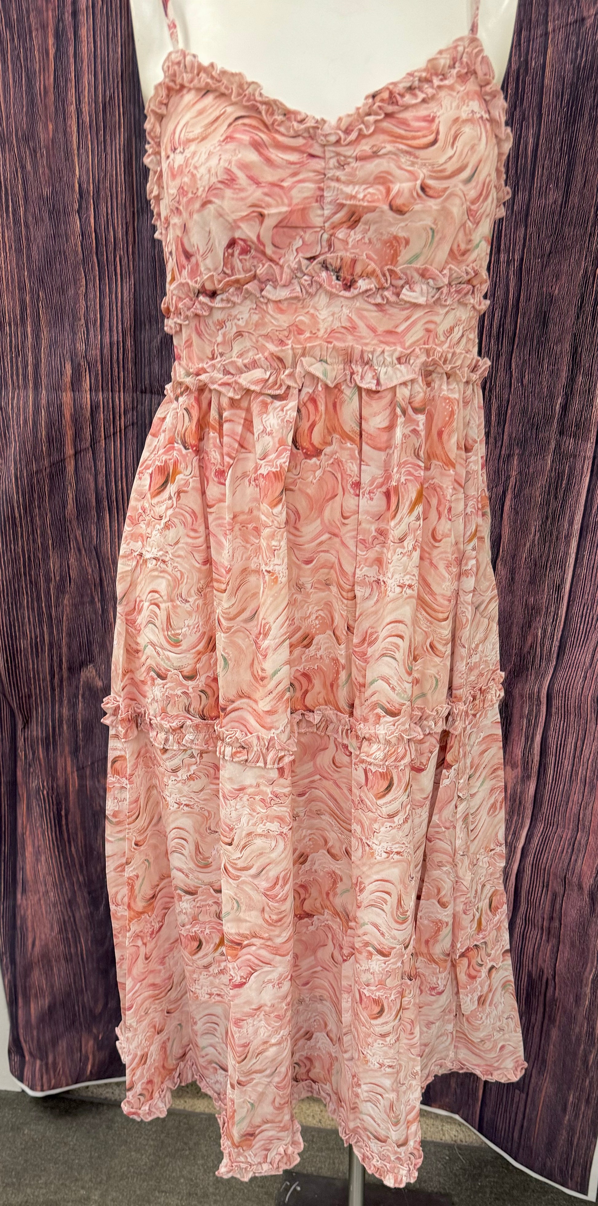 Sleeveless ruffle detailed printed midi dress, 97% polyester 3% spandex