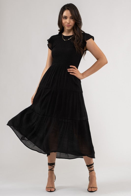 Smocked tiered midi dress, 62% rayon 38% polyester