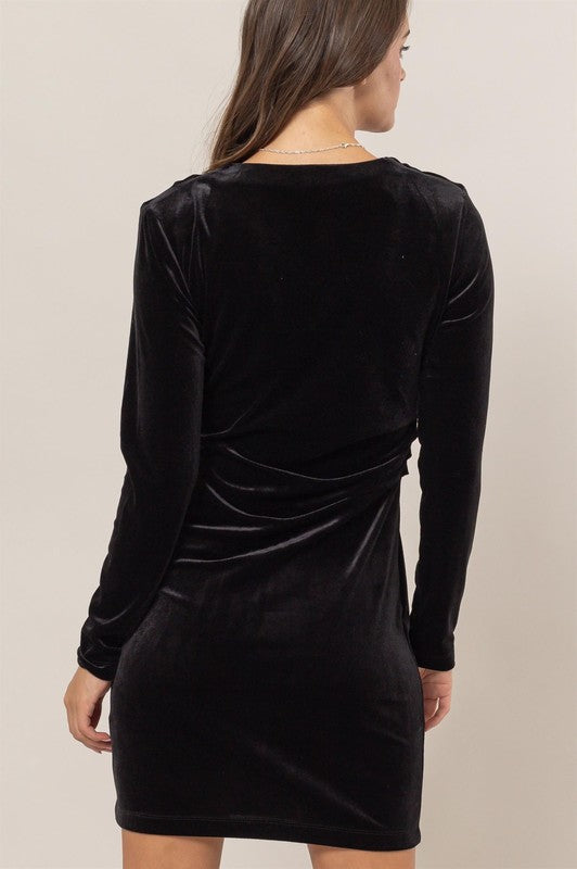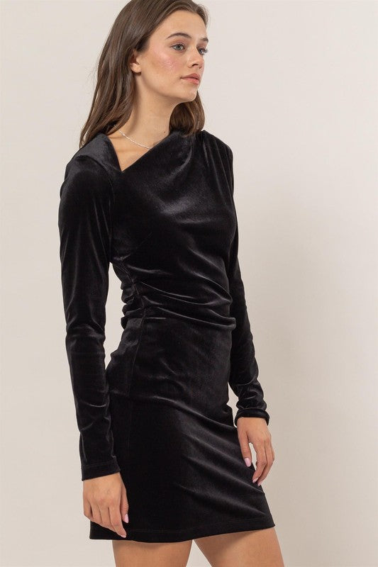 Velvet asymmetrical neck mini dress, 92% poly 8% spandex